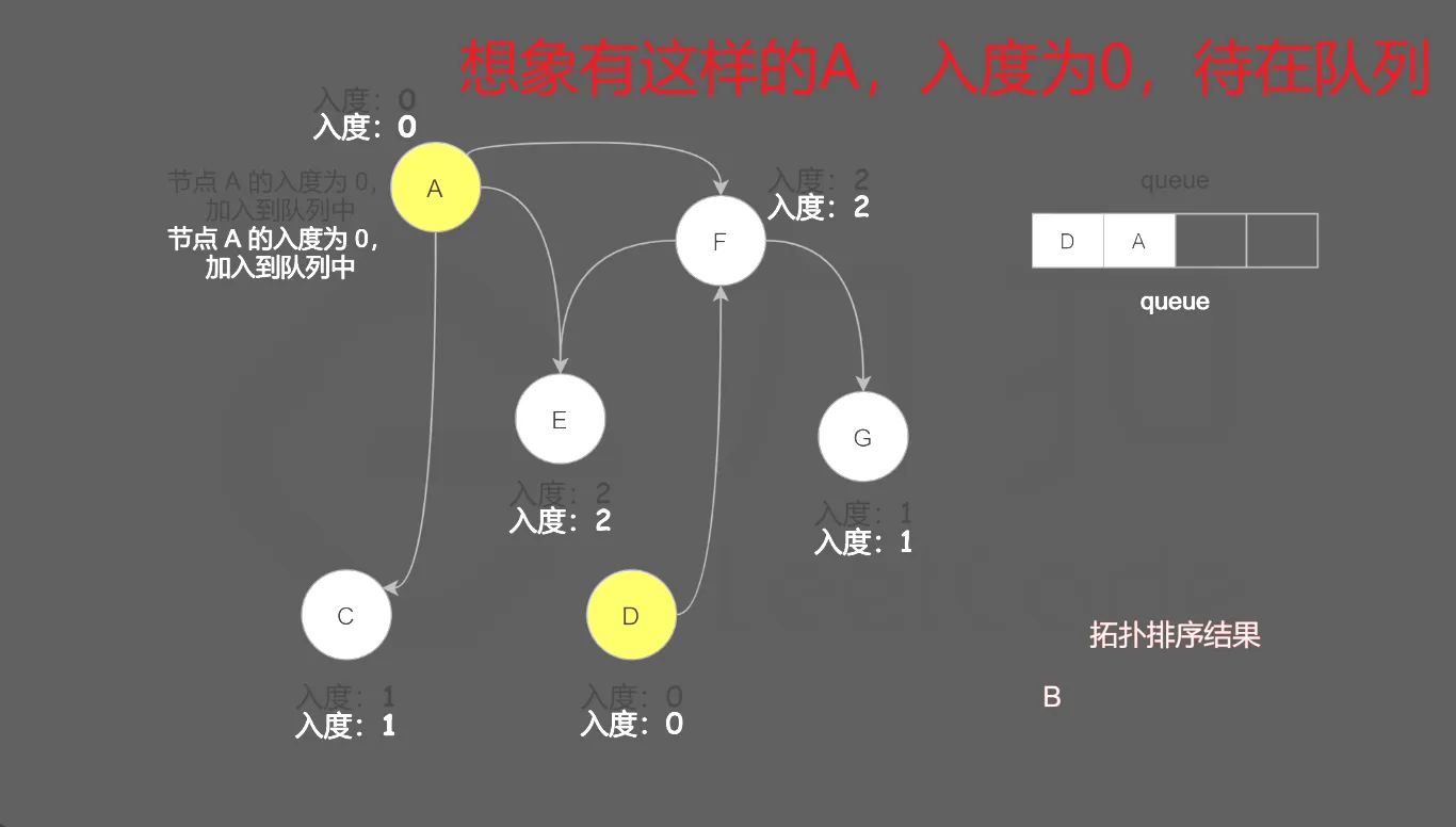 循环逻辑为:visited++(我又访问到一个节点),拿到这个节点 u,把这个 u 指向的所有 v 都减一,如果发现谁入库为 0 了,再加到队列中。